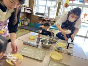 フリフリおにぎり挑戦!ちゅうりっぷ組(満3歳児)のこども達も幼稚園で初めてのクッキングに大喜び!