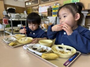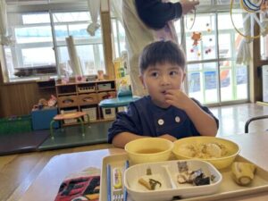 大きなお口を開けて食べる子や、フォークを使って大事そうに食べる子…みんな今日の給食はいつもよりもとてもおいしそうに食べていました。