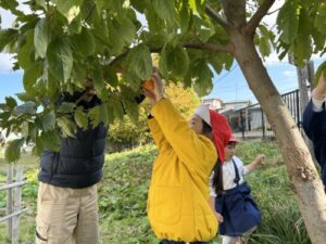 長者幼稚園に柿の苗がやってきて5年?6年?が経過し、今年初めて柿の実がなりました!
