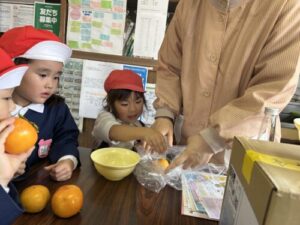 園長先生に収穫の報告をし、栄養士の先生と渋抜き作業をしました
