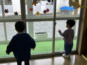 くるみハウスさんとちゅうりっぷ組さんは、窓の外を見て「まだ降ってる?」と雪に興味関心