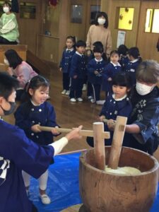 こども達も餅つきに挑戦!年長さんにもなると一人で杵が持てるようになっていました!