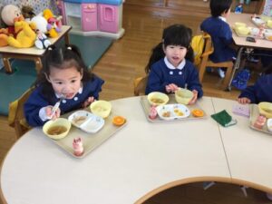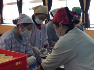 お手伝いお母さんや先生たちがお餅を小さくして給食準備!
