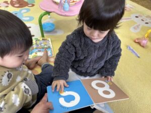 今年度の長者幼稚園の一番小さなお友達は、数字の絵本に夢中!