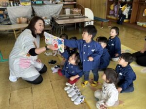 椅子に座れなくても大丈夫!みんなでカーペットに座って絵本の読み聞かせ(導入)からスタート!