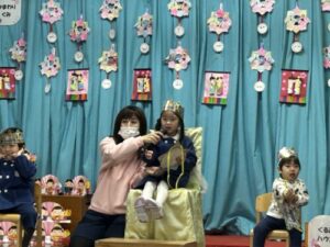 3月生まれのお誕生会が行われました。今月の年長組さんの折り紙は「お花」