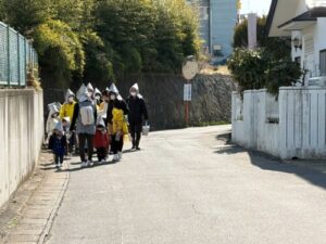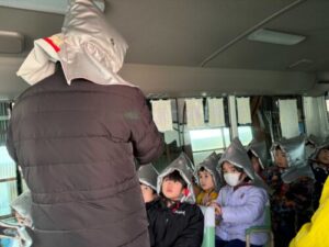 園舎前に避難した後、「もしも 停電してしまったら?」を想定し、暖を取るため園バスで待つため園舎前から歩いてバス駐車場まで歩いていきました。