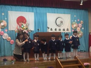 ドキドキだったけど、椅子に座って園長先生やお客様のお話をきちんと聞くことができました。