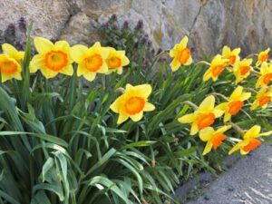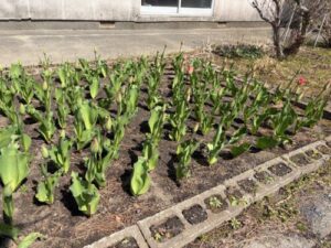 幼稚園の入り口までの道に咲く「スイセン」や別館前の「チューリップ」