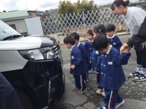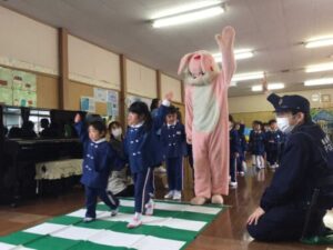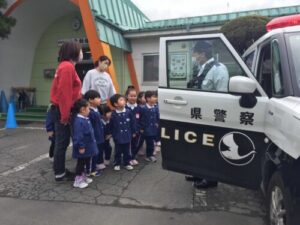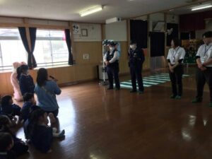4月16日(木)中央交番所の警察官の方・モータースクールの方に来園して頂き、交通安全教室が行われました。